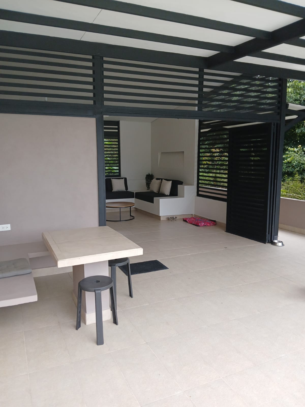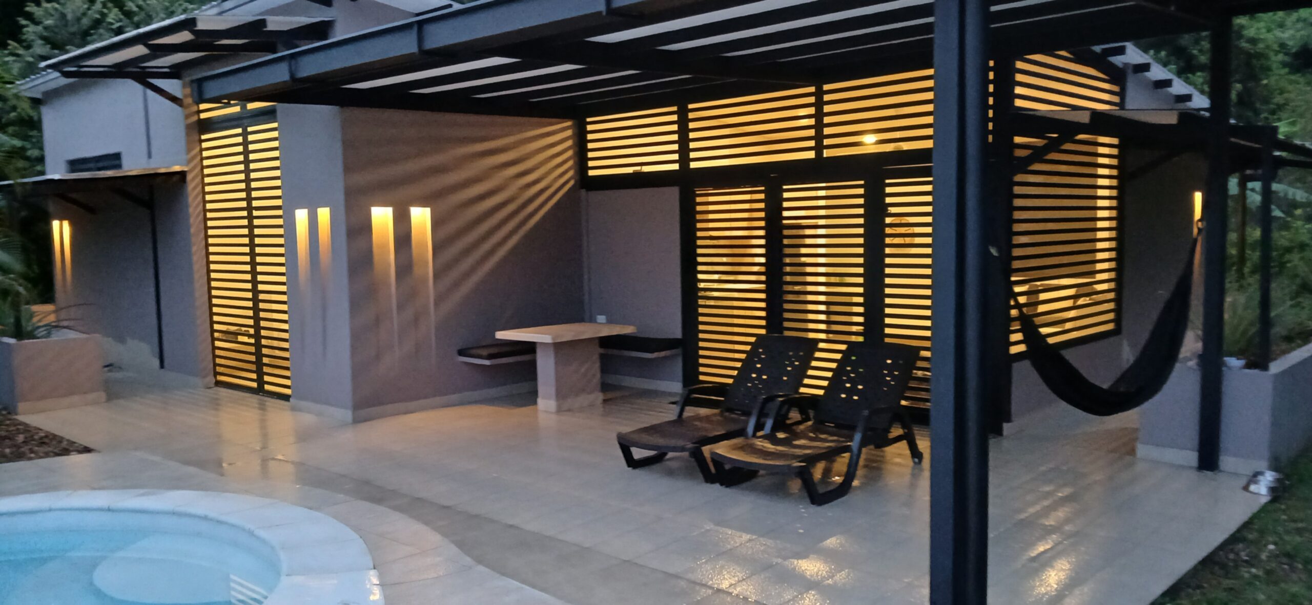 The cabana features a Coryan “rocket” cook stove, a rainwater harvesting system, a passive heating and cooling system, and one hundred percent warm LED lighting. Every room has two lighting options; bright and dim. The doors and windows were specifically designed to let hot air escape, let the sounds of the birds and smell of the rain enter, but without letting any animals enter. In summary, this cabana was designed to create a self sufficient, beautiful, comfortable, safe, and close-to-nature experience.